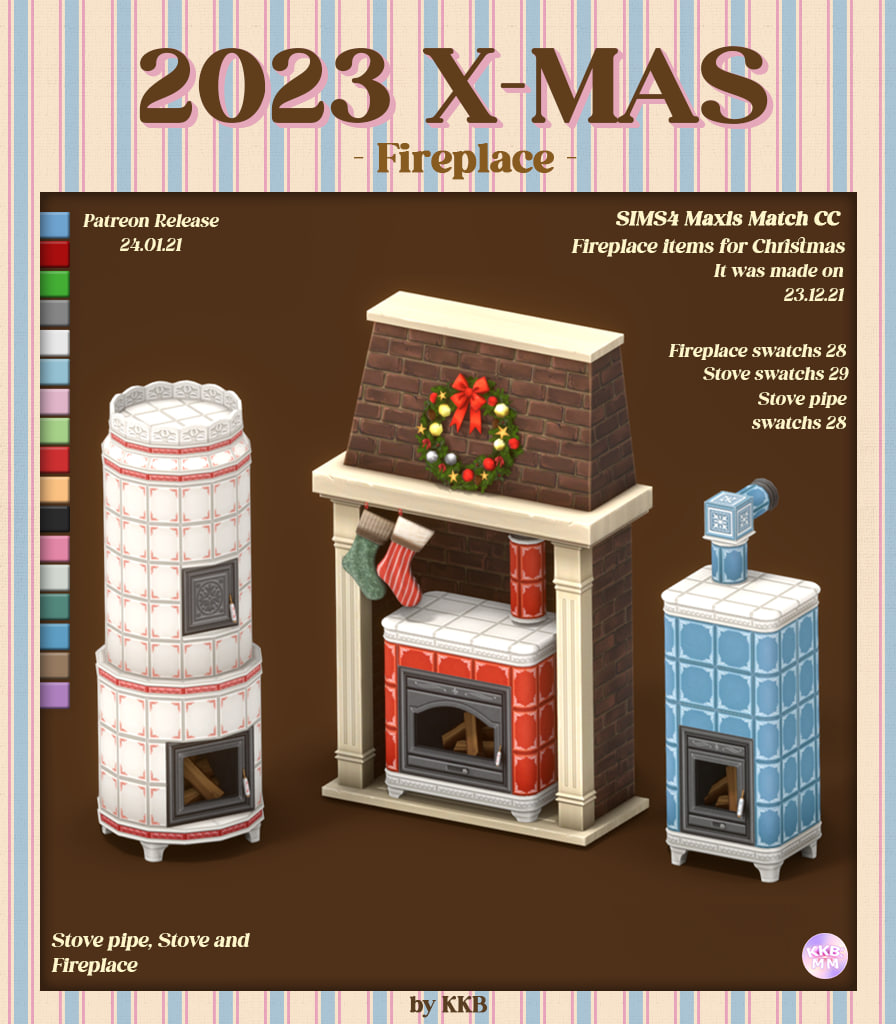 2023 X-MAS – Fireplace by KKB gives you a Maxis match fireplace set with three ceramic style stoves, two stovepipes and a decorated fireplace. It is base game compatible and perfect for old town builds, alpine cabins or historical storytelling saves.