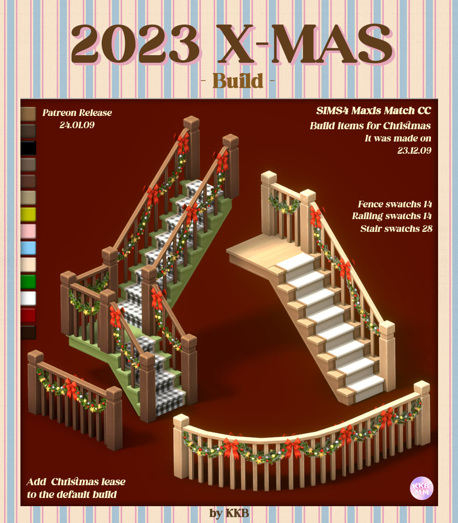 2023 X-MAS – Build by KKB is a small build set that includes a festive fence, railing and stairs. All items are base game compatible and use a Maxis match style, so they blend nicely with EA exteriors but still look more detailed and special.