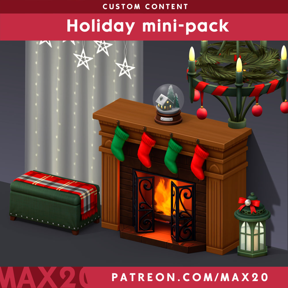 Holiday mini pack adds seven new items: a special “door for Santa” fireplace, warm colored chandelier, glowing curtains, a holiday candle, a festive ottoman, a snow globe and a stand fir branches. This tiny pack is ideal if you prefer to keep your CC folder small but still want a clear winter feeling in screenshots.