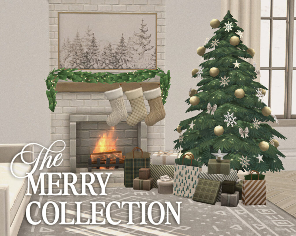 The MERRY Collection by Lijoue is a Christmas themed clutter and decor set that leans into soft, warm colors and elegant details. It is perfect for Sims who want a gentle, aesthetic winter look instead of heavy red and green everywhere. You can use it to dress up shelves, sideboards and fireplaces in both modern and traditional homes.