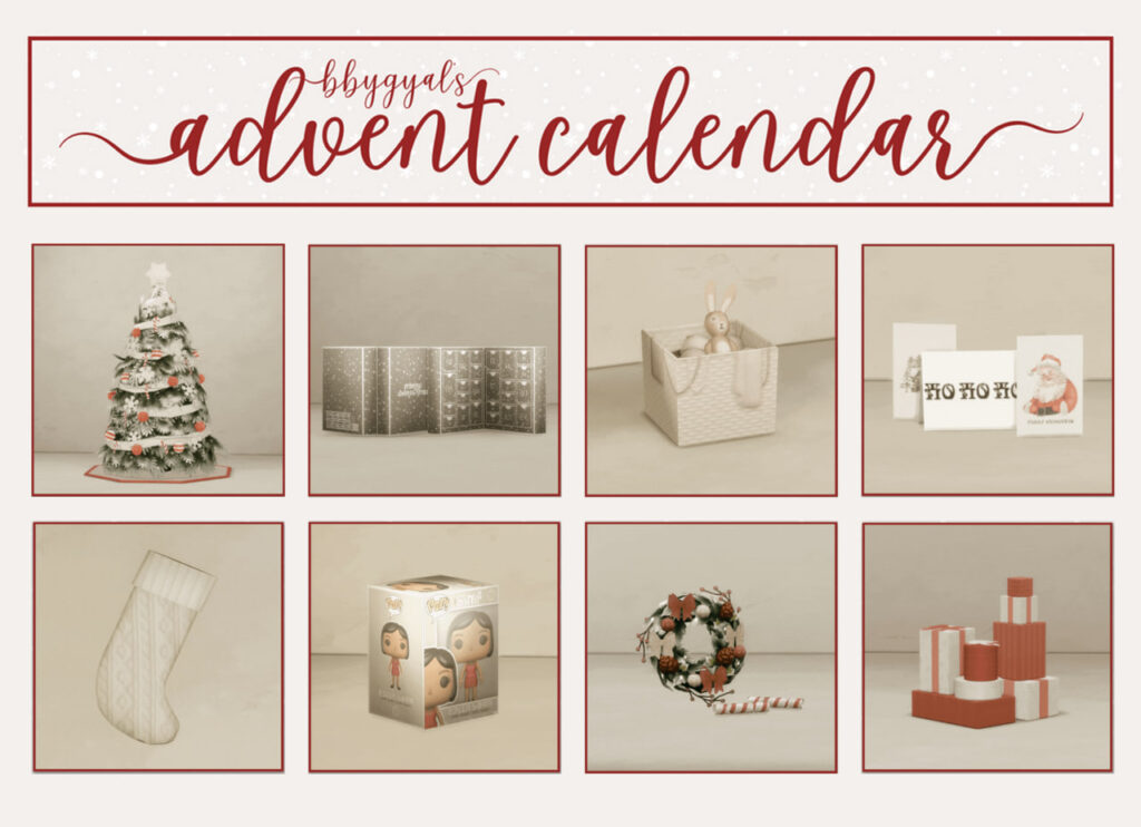 bbygyal’s advent calendar 2023 is focused on Christmas and gift giving. It includes recolors, meshes, a CAS background, a loading screen. Some items need packs like Seasons, Snowy Escape, Growing Together, High School Years, Knifty Knitting and Cottage Living, so this calendar works best in a pack-heavy game.