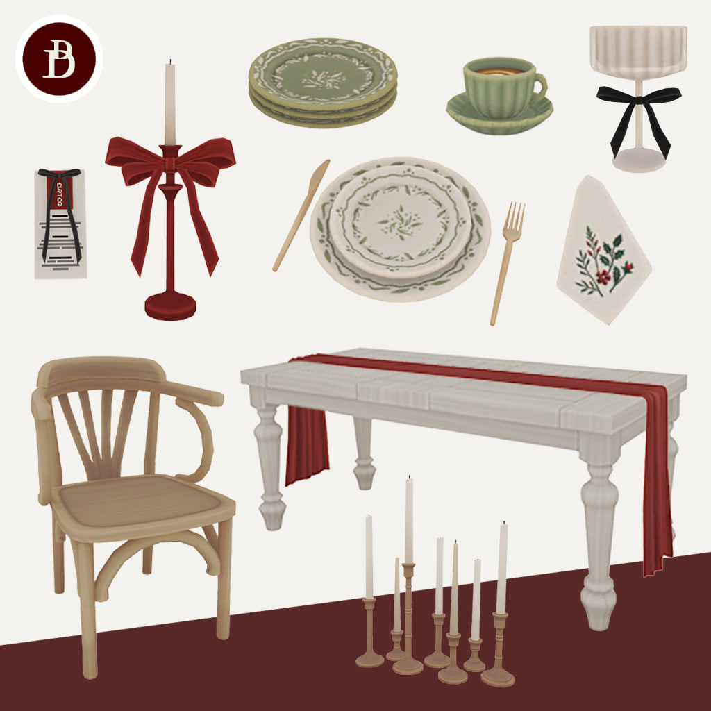 Ageless – Dining Room is a clean, stylish dining set that works well for Winterfest dinners and New Year parties. The pack includes a dining table, chairs, candles, ribbon candles, tableware, plates, glasses, runners, menus and napkins, all made to match and all base game compatible.